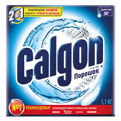 КАЛГОН «2в1» – средство, использующееся сразу в двух случаях: при образовании накипи в стиральных машинах и для смягчения жесткой воды. Кроме этого, порошок препятствует оседанию налета на внутренних частях машинки-автомата и блокирует появление неприятного запаха при стирке. Порошковое средство создает защитный барьер на внутренних деталях машинки-автомат. Помимо своего прямого назначения, средство улучшает качество стирки в целом. Оно используется вместе с основным стиральным порошком в таком количестве, которое зависит от уровня жесткости воды. Порошок, благодаря своему уникальному составу защищает от повреждений и накипи нагревательный элемент и барабан машинки. Главные преимущества: экономит стиральный порошок, экономит электроэнергию (так как, без накипи нагревательный элемент работает в нормальном режиме и не требует дополнительной энергии), предотвращает оседание накипи на белье. Состав: углекислый натрий, триполифосфат натрия, 30% цеолитов, 5% поликарбоксилатов, неиногенные ПАВ.