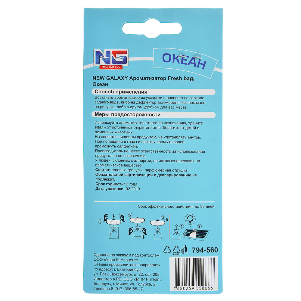 Автомобильный ароматизатор New Galaxy Fresh bag быстро и эффективно устранит неприятные запахи в вашем автомобиле и придаст легкий приятный аромат. Такой ароматизатор можно повесить на зеркало заднего вида, либо на дефлектор. Чтобы подарить себе и близким комфортные поездки в любимом автомобиле, достаточно купить этот ароматизатор.