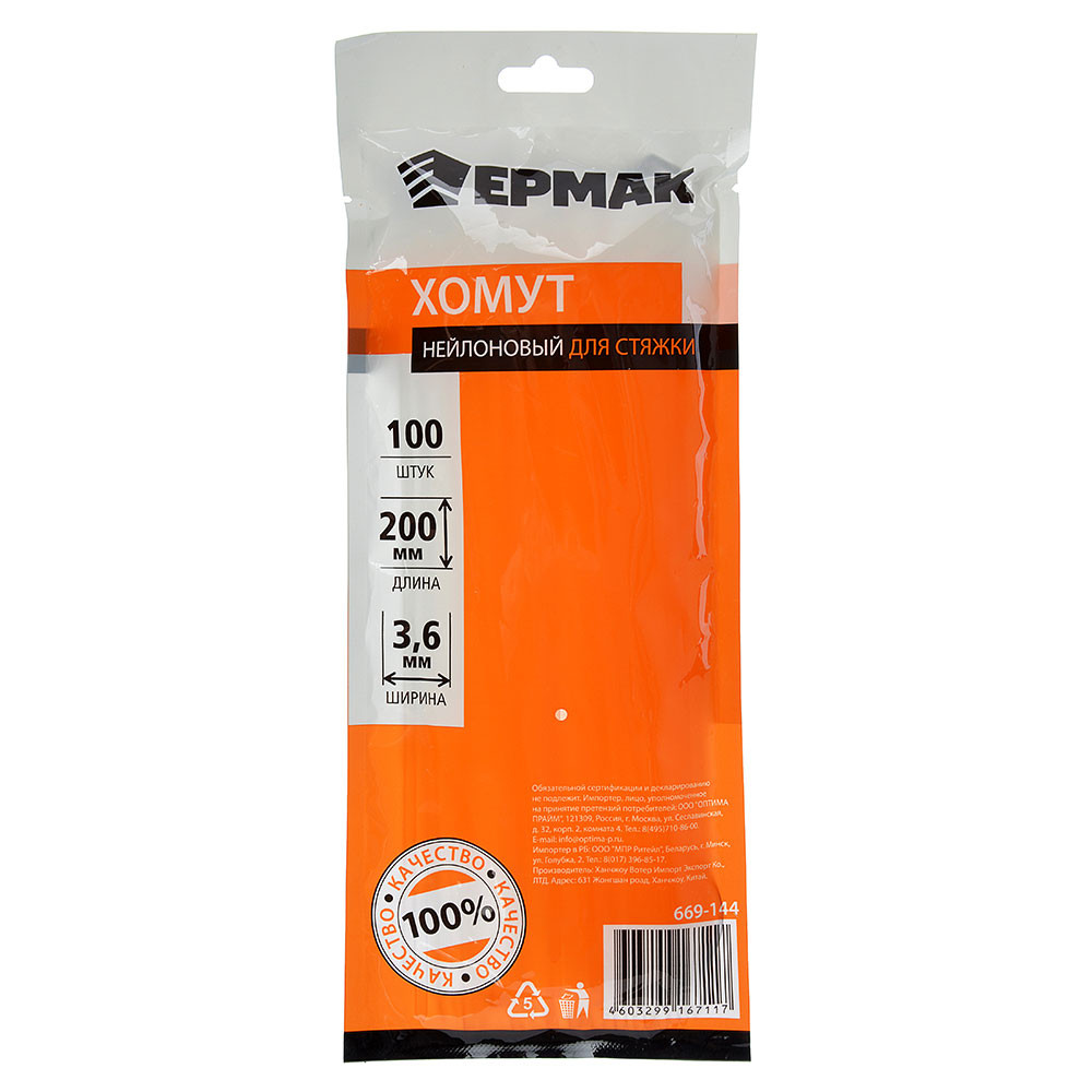 ЕРМАК Хомут нейлоновый для стяжки 3,6х200мм, белый 100шт/уп
