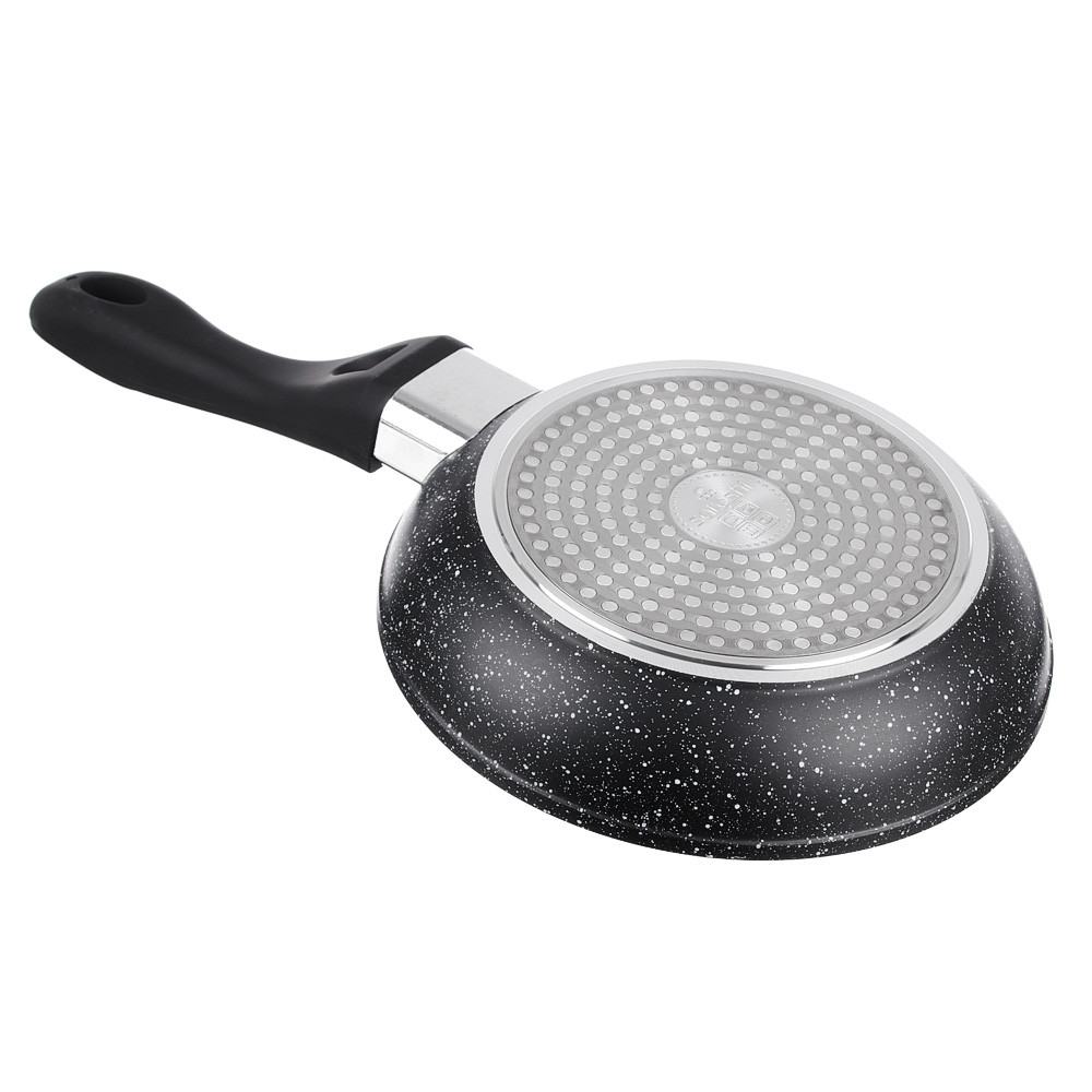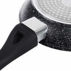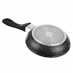 Сковорода диаметром 20 см из литого алюминия, с антипригарным "мраморным" покрытием, с бакелитовой ручкой с покрытием "софт-тач" и индукционным дном - подходит для использования на всех видах плит.