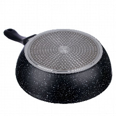 Сотейник диаметром 28 см из литого алюминия, с антипригарным "мраморным" покрытием, с бакелитовой ручкой с покрытием "софт-тач" и индукционным дном - подходит для использования на всех видах плит.