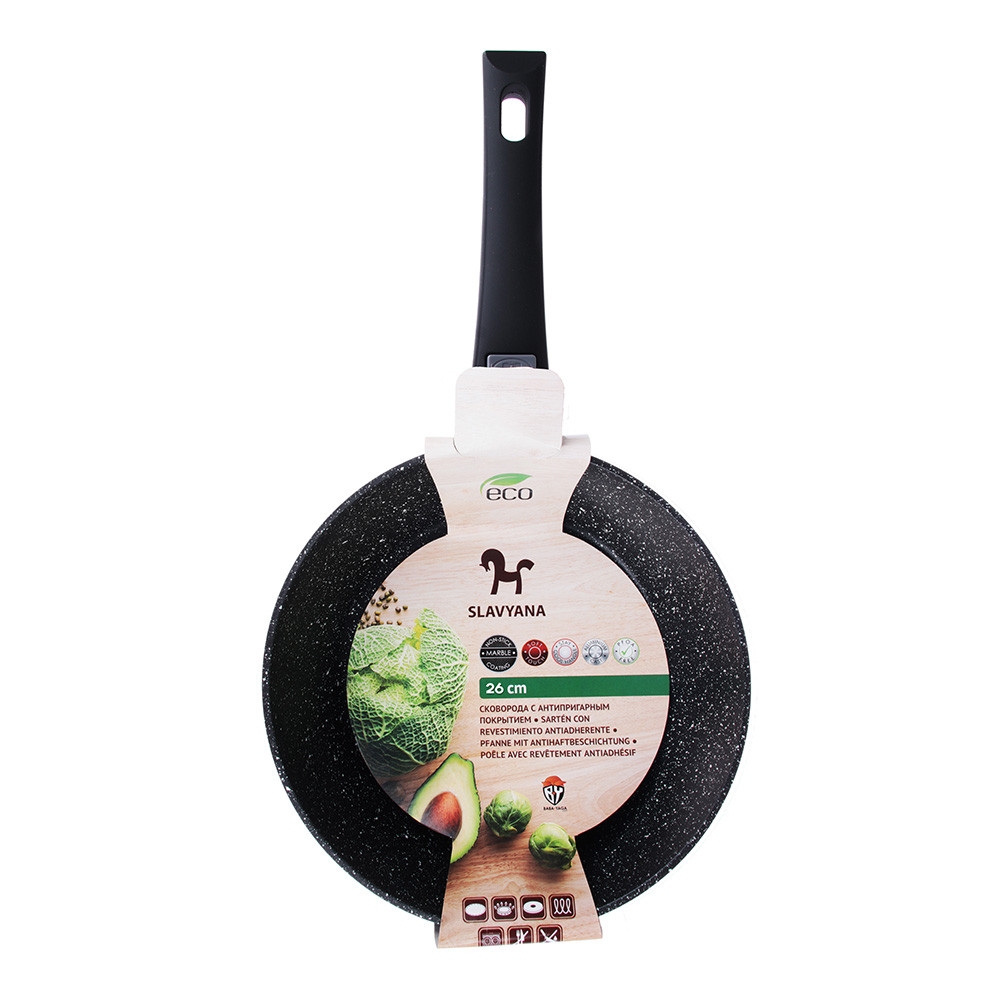Быстро прогревается. К ней никогда не прилипает еда. Легко моется в машинке-автомат. Сковорода СЛАВЯНА Оникс диаметром 26 см заставит вас полюбить готовку, даже если до этого вы ели только полуфабрикаты. Готовьте традиционные блюда с душой, как это делали наши бабушки. Курица с рисом, жаренная картошка, котлеты, рагу — ни одно блюдо не прилипает к посуде. Прекрасная помощница на каждой кухне.