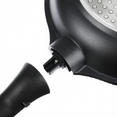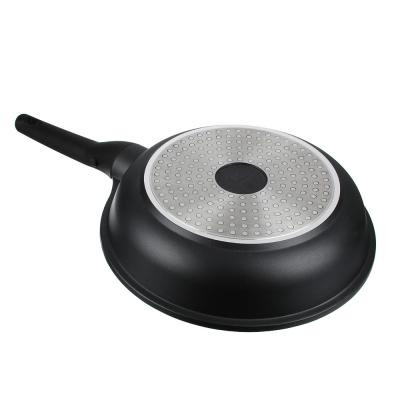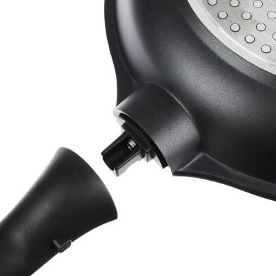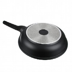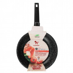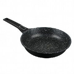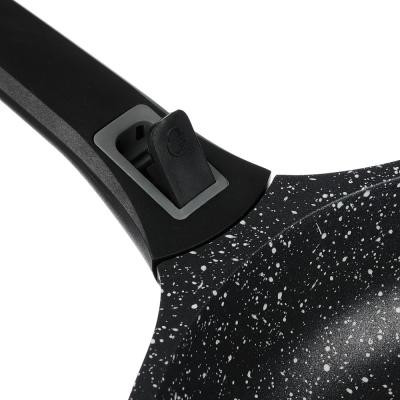 Сковорода диаметром 26 см из литого алюминия с 2-х слойным антипригарным покрытием Мрамор изнутри и краской черного цвета снаружи, с бакелитовой съемной ручкой, подходит для всех типов плит, включая индукцию.