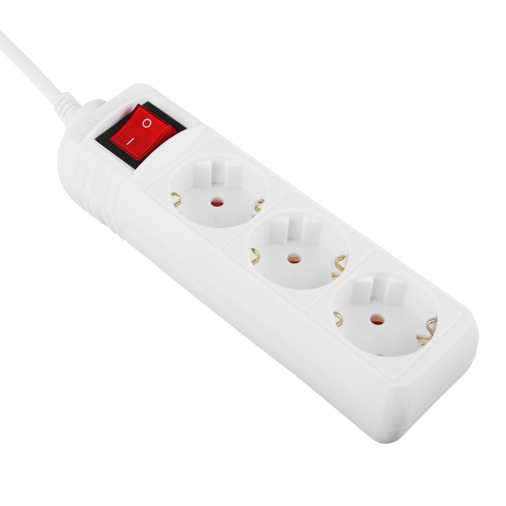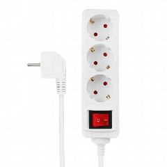 Универсальный электрический удлинитель с заземлением. Оснащен выключателем. Предназначен для нестационарного подключения потребителей к электрической сети переменного тока, на 3 евророзетки, с максимальной мощностью 3500Вт, длина шнура 3 метра.