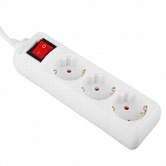 Универсальный электрический удлинитель с заземлением. Оснащен выключателем. Предназначен для нестационарного подключения потребителей к электрической сети переменного тока, на 3 евророзетки, с максимальной мощностью 3500Вт, длина шнура 2 метра.