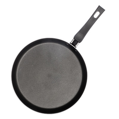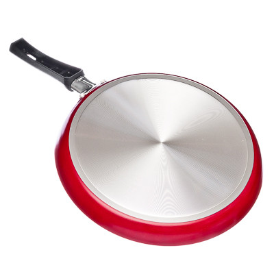 Сковорода блинная диаметром 25 см из штампованного алюминия с 2-х слойным антипригарным покрытием Akzo Nobel черного цвета изнутри и красной краской снаружи, с бакелитовой ручкой черного цвета с петлей для подвешивания - подходит для всех типов плит, кром