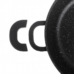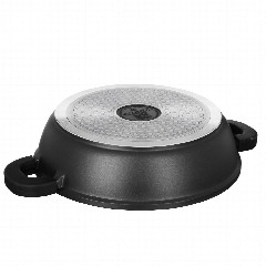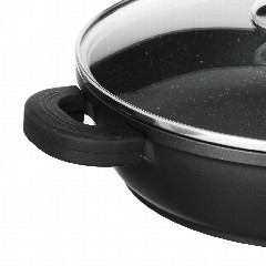 Сотейник диаметром 24 см из литого алюминия с 2-х слойным антипригарным покрытием Мрамор изнутри и краской черного цвета снаружи, с силиконовыми накладками на ручки, подходит для всех типов плит, включая индукцию.