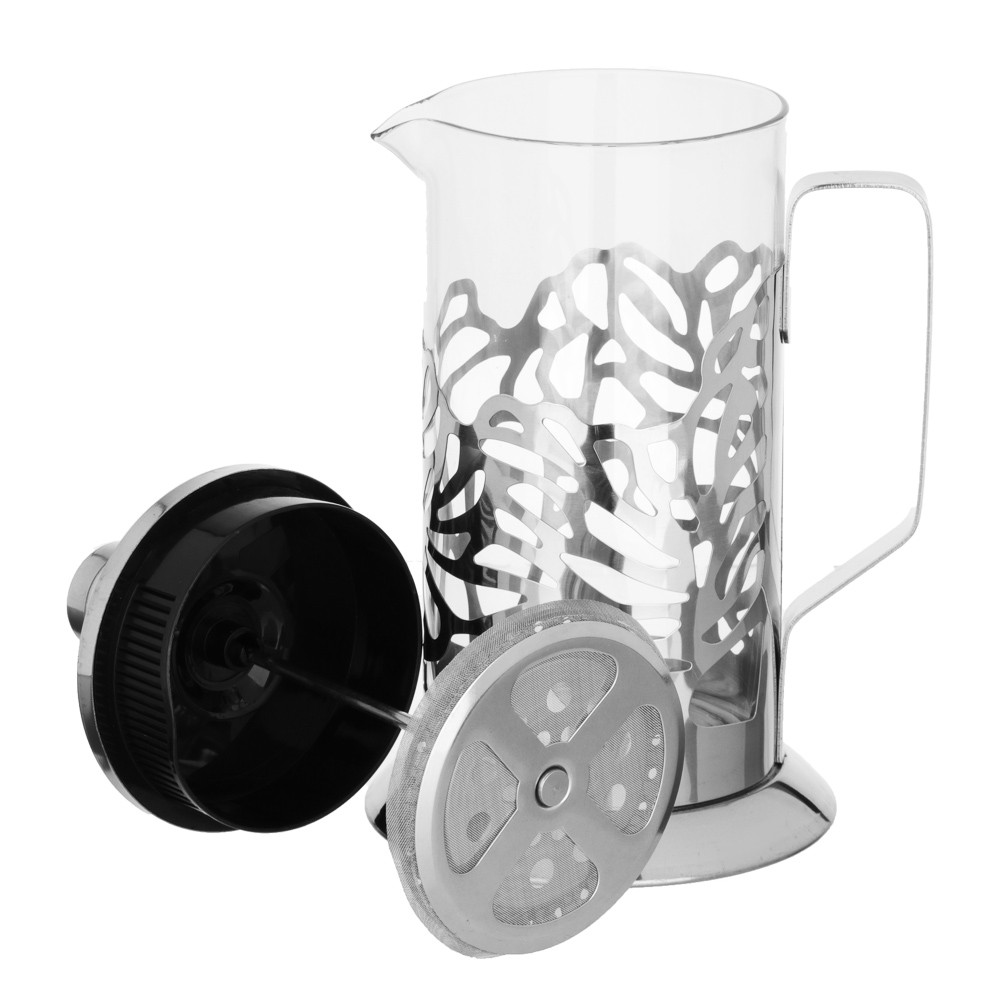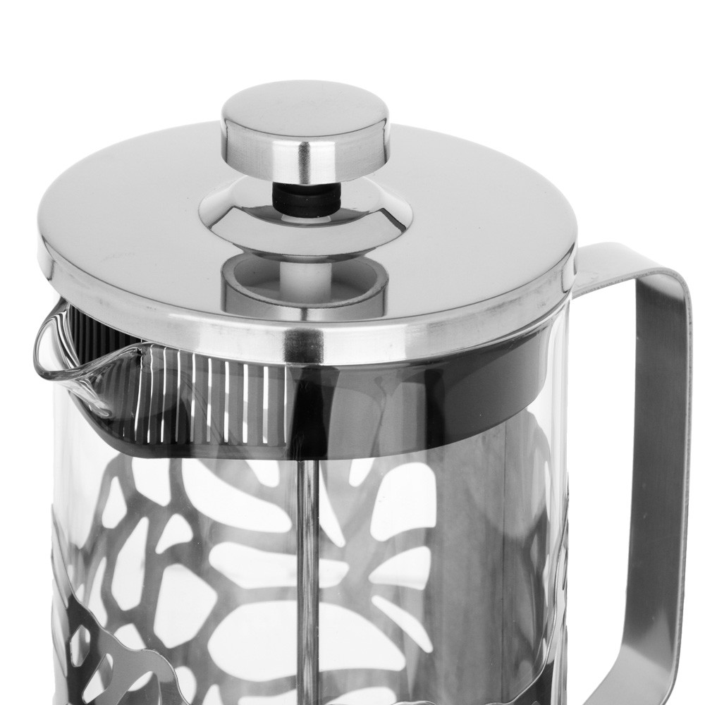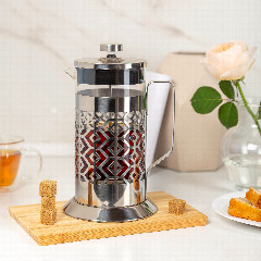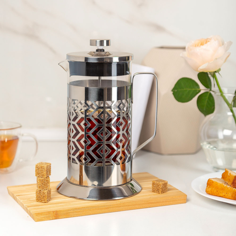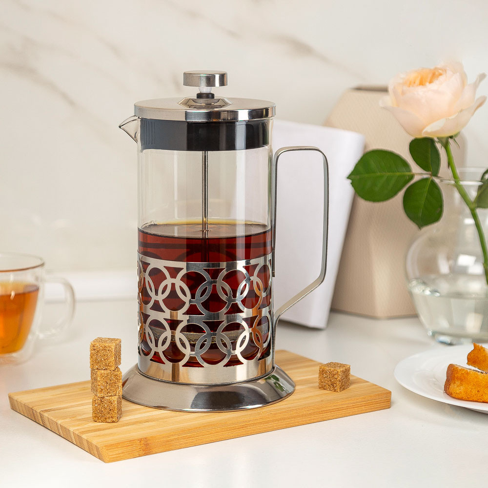 Популярность френч-прессов во многом объясняется их универсальностью и практичностью. Френч-пресс Гельсингфорс от Satoshi изготовлен из жаропрочного стекла, имеет классический дизайн и большой объем на 1000 мл. Фильтр с поршнем выполнен из нержавеющей стали, что является гарантией надежности изделия. Френч-пресс подходит для заваривания чая и кофе. Элементы из нержавеющий стали несут не только декоративную функцию – стальная подставка защитит стол и скатерть от воздействия высоких температур, а стеклянный корпус – от механических повреждений.